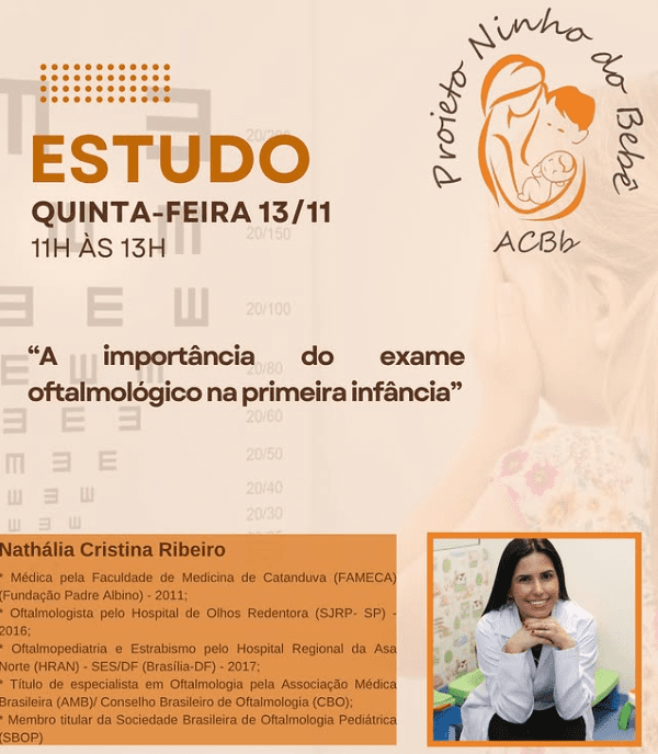 Nesta quinta-feira às 11h em nosso grupo de estudos, receberemos a nossa voluntária @dranathaliacristinaribeiro oftalmologista pediátrica que abordará o seguinte tema: “A importância do exame oftalmológico na primeira infância”. Venha conhecer nosso… Continuar lendo A importância do exame oftalmológico na primeira infância