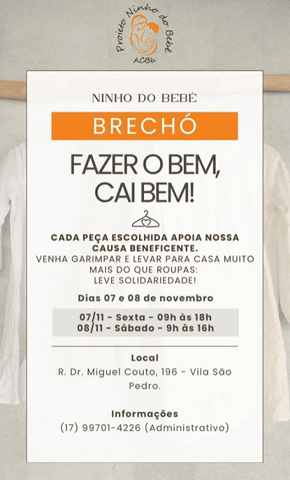 🛍️ Fazer o bem cai bem! 🧡 Nos dias 07 e 08 de novembro, o Projeto Ninho do Bebê realiza mais uma edição do seu brechó solidário, com o objetivo